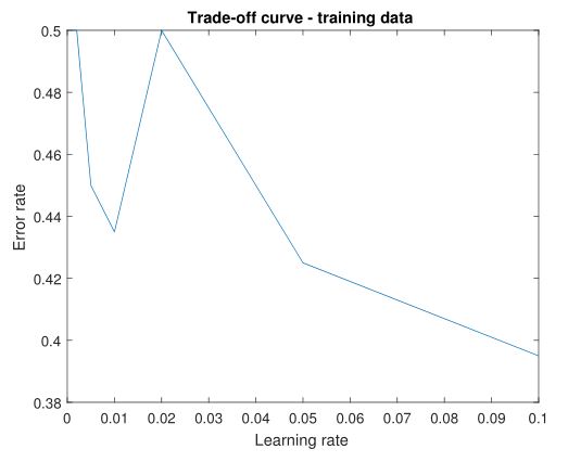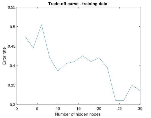 In tuning learning rate, I fixed number of hidden nodes at 25 and applied randomized SGD. From Plot 3, it can be observed a rough decline of error rate on the range of 0 to 0.1. Intuitive drawback of too small learning rate is the model converges more slowly and thus results in higher error rate. On the other hand, learning rate cannot be too large either, which will make our model too volatile.