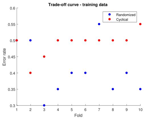 The second plot is a scatter plot of error rate for each fold. On average randomized SGD performs better than cyclic. Preliminary stage of model tuning provides clear guidelines and benchmark for further improvement over model efficiency in the future.